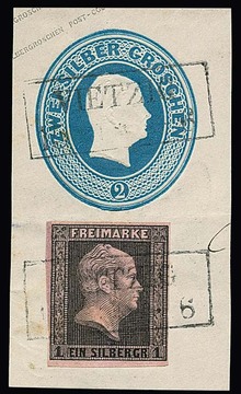1 Sgr. schw./rosa auf Abschnitt einer Ganzsache 2 Sgr. blau, mit hierauf seltener Ortsstempel-Entwertung durch Ra2 "Vietzig". Obwohl Marke vollrandig, Rand unnötigerweise links verbreitert