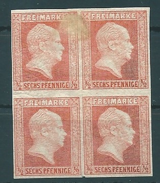 1/2 Sgr. ziegelrot, Neudruck von 1864 im Viererblock, oberes Paar Fleck, unteres bis auf winzige Gummiabsplitterung Mitte gut, hier eine Marke postfrisch