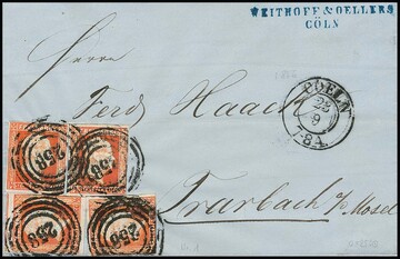 1/2 Sgr. ziegelrot per vier (zwei Marken einseitig berührt) auf Faltbrief mit NS "258" und K2 "Coeln" 1856 nach Trarbach/Mosel
