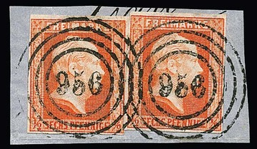 1/2 Sgr. rotorange, zwei voll- bis breitrandige Exemplare auf Kabinettbriefstück mit klaren NS "956" (Mittelwalde)