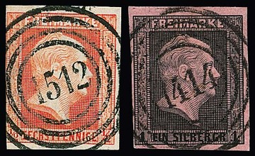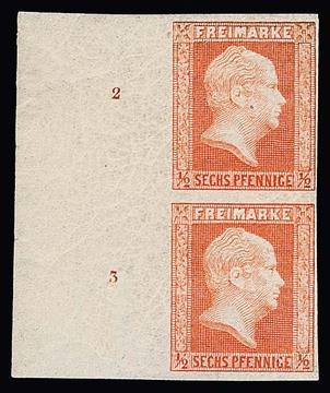 1/2 Sgr. rotorange, Neudruck von 1864 im postfrischen Randpaar, Fotoexp. Flemming, sowie die anderen drei Neudrucke einzeln (sign.), Mi. 700,- lose