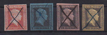 1/2 Sgr. ziegelrot bis 3 Sgr. schw./dunkelgelb, alle vier Werte einheitlich mit Federkreuz-Entwertung (Bahnpost)