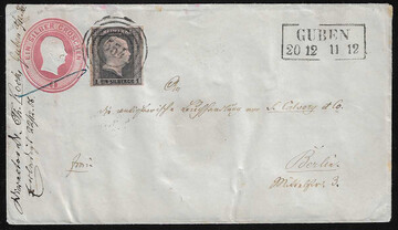 1 Sgr. schw./rosa auf Ganzsache 1 Sgr. rosa aus Guben, sowie 2 Sgr. schw./blau auf Großformat-Ganzsache 2 Sgr. aus Gramenz (R-Brief, Mgl.)