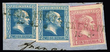 1 Sgr. rosa, Kabinettstück auf dünnem Papier, sign. Flemming, Banker, sowie Dreierstreifen (li. Marke ber.) auf Briefstück, Mi. 320,-