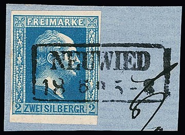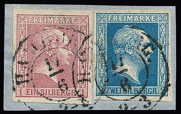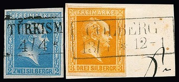 2 Sgr. blau einzeln mit besserem Saar-Ra2 "Türkismühle", sowie 3 Sgr. dunkelorange auf Briefstück mit vollem Ra2 "Colberg", sign. Drahn, je Kabinett, Mi. 260,-