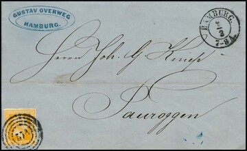 3 Sgr. orange einzeln auf vollständigem gefaltetem Prachtbrief 1858 von Hamburg nach Tauroggen/Rußland