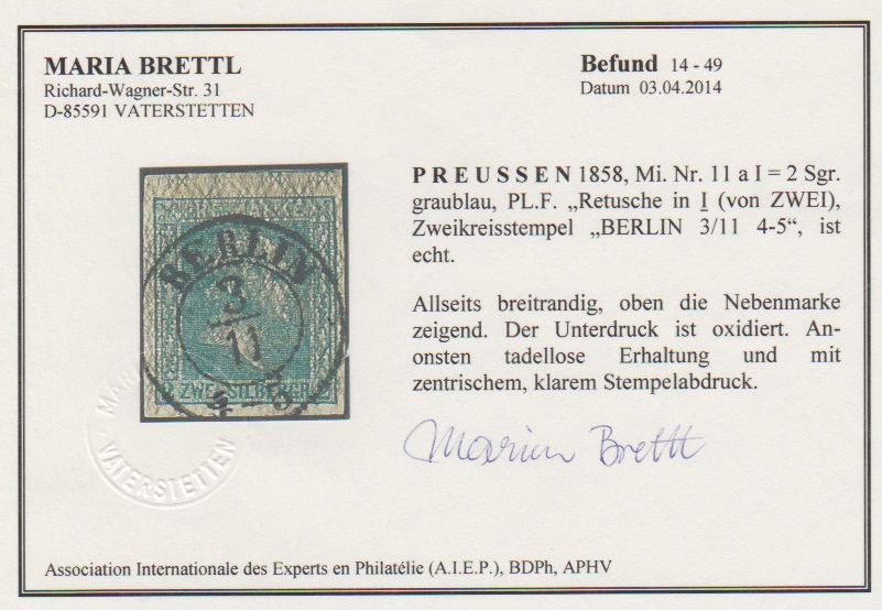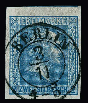 2 Sgr. blau, Plattenfehler "schräges I", schön gestempeltes Prachtstück (Unterdruck etwas hervortretend) mit zentrischem K2 "Berlin", Fotoexp. Brettl. Mi. 400,-