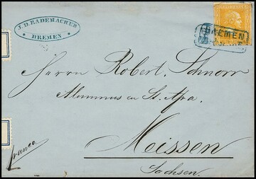 3 Sgr. orange auf Prachtbrief mit auf dieser Marke seltenem kleinem blauem Ra2 "Bremen Bahnhof", sign. Flemming, leichte Gebrauchsspuren
