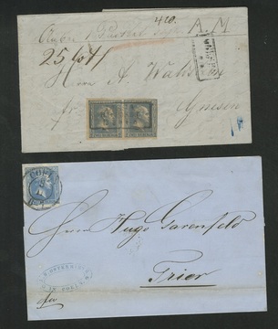 2 Sgr. dunkelblau, waagerechtes Paar (rechts etwas ber.) auf Paketbegleitbrief mit Ra3 "Lissa R.B. Posen", aus der Teilauflage mit rosa Gummi stammend, dazu weiterer Brief mit min. ber. 2 Sgr. blau