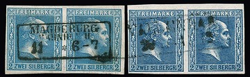 2 Sgr. blau und dunkelblau (sign. Krause), zwei Kabinettpaare, mit idealem Ra3 "Magdeburg Bahnhof" bzw. Ra2 "Vallendar", Mi. 235,-