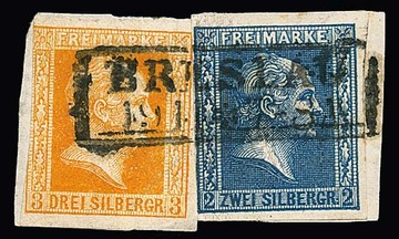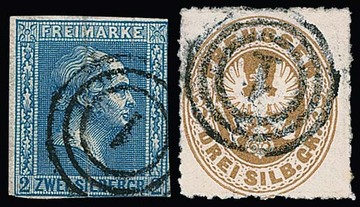 2 Sgr. schwarzblau, tadellos, in Mischfrankatur mit etwas berührter 3 Sgr. orange auf Briefstück mit Ra2 "Breslau", Mi. 600,- +