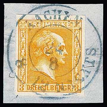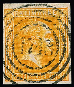 3 Sgr. orange mit hierauf seltener Nummernstempel-Entwertung (wahrscheinlich "1745", winzig punkthell). Mi. 500,-