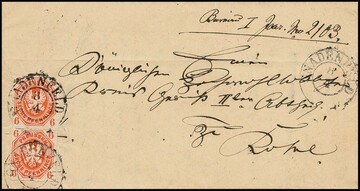 6 Pfge. rotorange, senkrechtes Paar (gering Scherentrennung) auf Post-Ins.-Doc. mit spät verwendetem vorphil. K2 "Gnadenfeld", bessere Frankatur, da Post-Ins.-Doc. nur für Hinweg mit 1 Sgr. frankiert. Sign. Banker