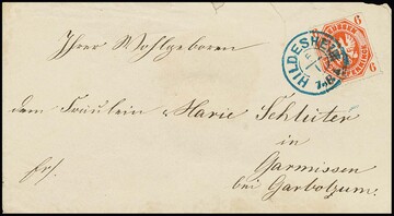 Wappen, sechs Belege, dabei Nr. 14a auf Streifband, 15a auf Ganzsache U26A (Wertbrief), zwei Briefe Nr. 16 aus gleicher Korrespondenz (blauer bzw. schwarzer K2 "Hannover" und je 2 Pfg. Botenlohn), Brief 1 und 2 Sgr., sowie Auslandsbrief mit Paar 2 Sgr. blau in die Schweiz
