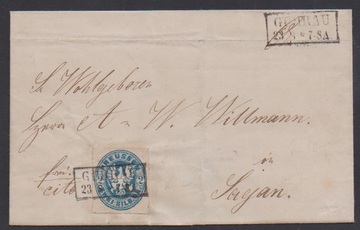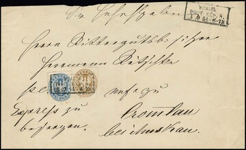 2 Sgr. blau und 3 Sgr. ockerbraun (kl. Durchstichkerbe) auf seltenem Land-Expreßbrief (Couvert oben verkürzt und kl. Papierfehler) von Berlin nach Cromlau bei Muskau. Die für die Landexpreßbestellung verklebten 3 Sgr. waren nicht ausreichend, so dass der Empfänger gemäß rs. Vermerk weitere "2" Sgr. bezahlen mußte