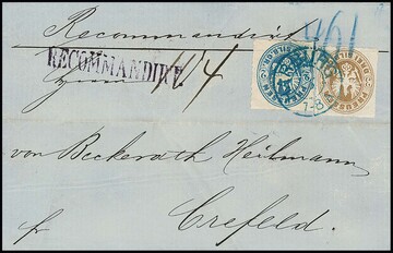 1 Sgr. rosa per vier (dabei Dreierstreifen) auf Einschreibebrief mit blauem Ra3 "Berlin Post-Exp. 8", ferner 1 und Paar 2 Sgr. auf Auslandsbrief von Cöln Bahnhof nach Genf, sowie 2 Sgr. hellblau per zwei auf Paketbrief aus Sprottau