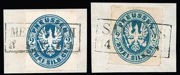 2 Sgr. preußischblau, zwei Pracht-/Kabinettbriefstücke mit vollen Ra2, "Mensguth" (Marke mit Plattenfehler am "E von ZWEI") und "Samtens"