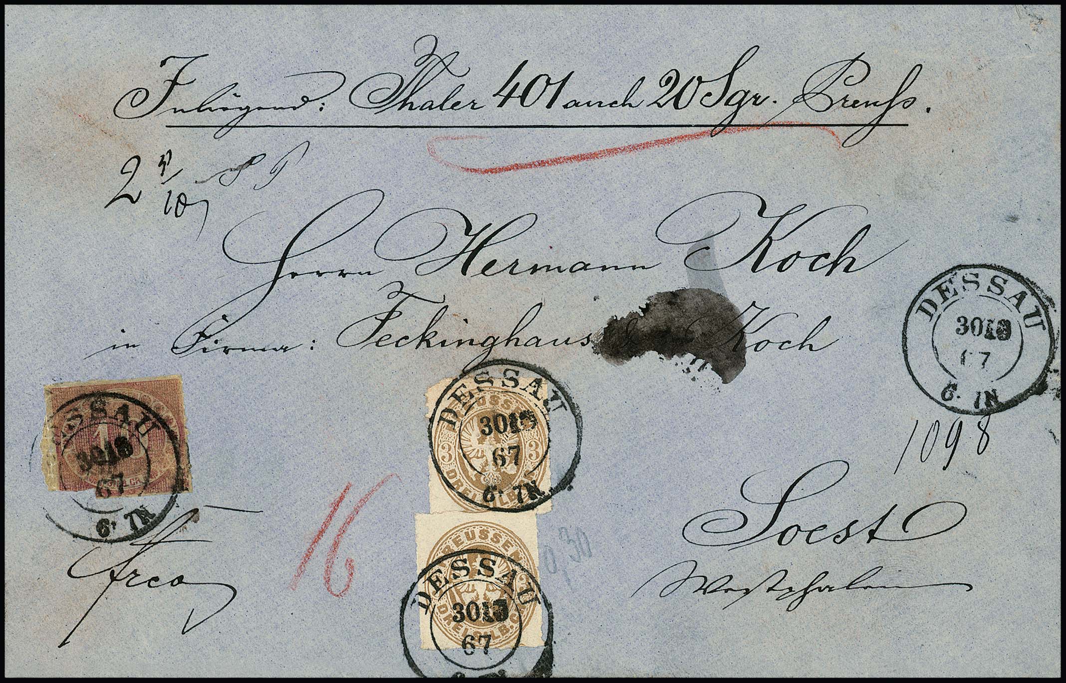 10 Sgr. rosa (Fehler) nebst zweimal 3 Sgr. ockerbraun auf ursprünglich erhaltenem Leinen-Wertcouvert von Dessau 1867 nach Soest