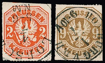 3 Sgr. erdbraun auf zwei Briefen (einer ohne Seitenklappen) 1865/66 aus Coeln. Einmal aptierter Bahnpost-Ra3 "Coeln Eisenb. Post-Bureau" als Markenentwertung (selten), einmal nebengesetzt und Marke mit Zug-L3 "Coeln-Mainz" entwertet. Mi. 300,-