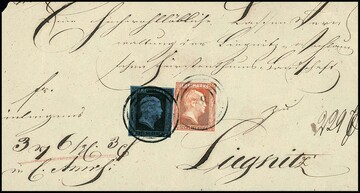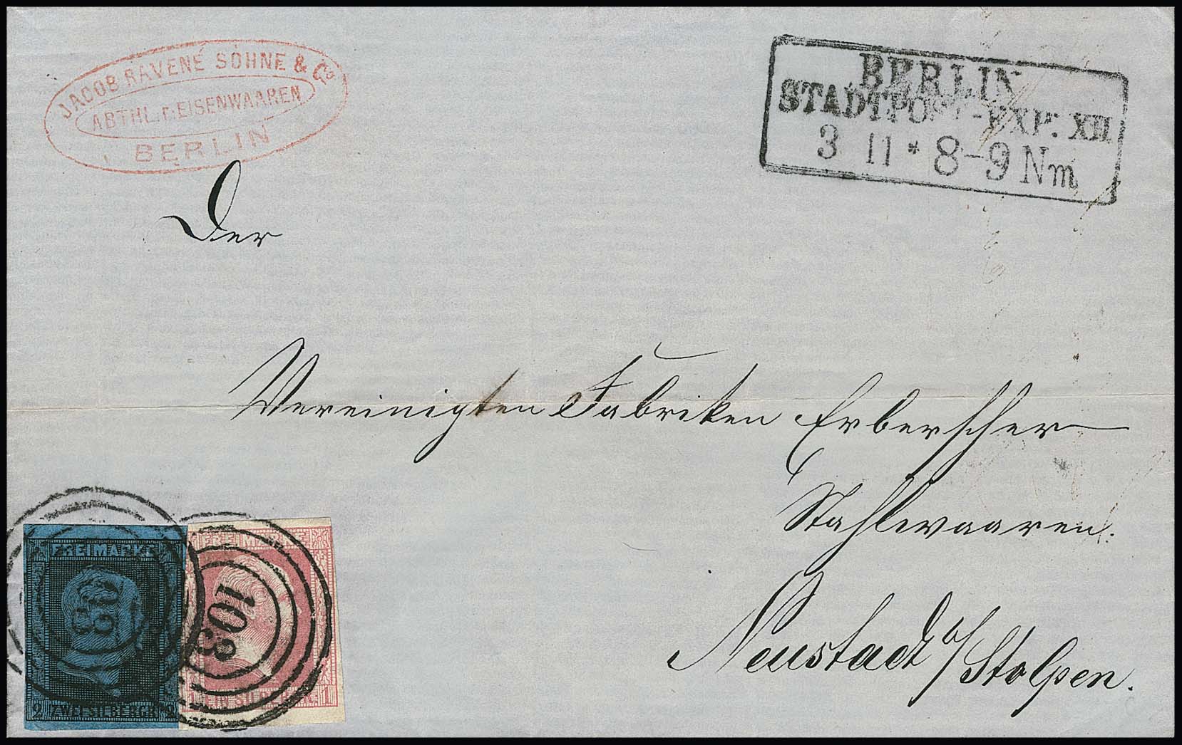 "103" nebst Ra3 "Berlin Stadtpost-Exp. XII" auf Faltbrief 1858 mit besserer Mischfrankatur 2 Sgr., 1., und 1 Sgr., 2. Ausgabe (etwas ber.)