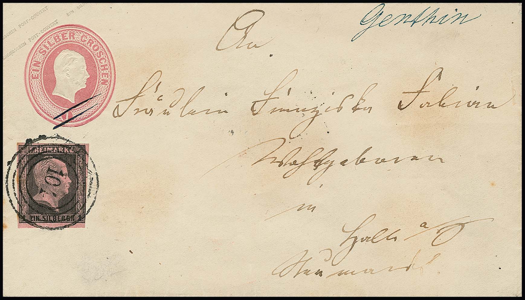 "104" (Berlin Bahnpost) nebst hs. Aufgabe "Genthin" auf Kopf-Ganzsache 1 Sgr. mit ZuF 1 Sgr. schw./rosa (min. ber.)