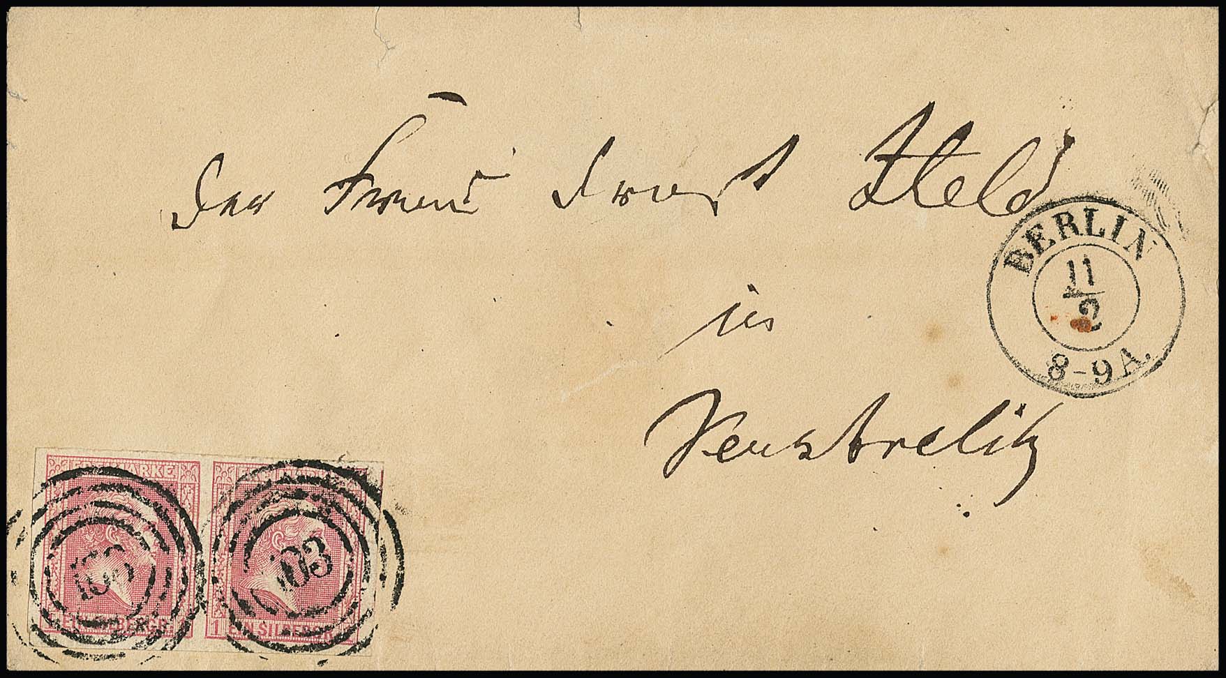 "103" nebst K2 "Berlin" auf Couvert (dieses Gebrauchsspuren) mit Prachtpaar 1 Sgr. Gittergrund