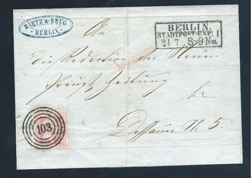 "103" nebst Ra3 "Berlin Stadtpost-Exp. I" auf gefaltetem Ortsbrief mit Prachtstück 1 Sgr.