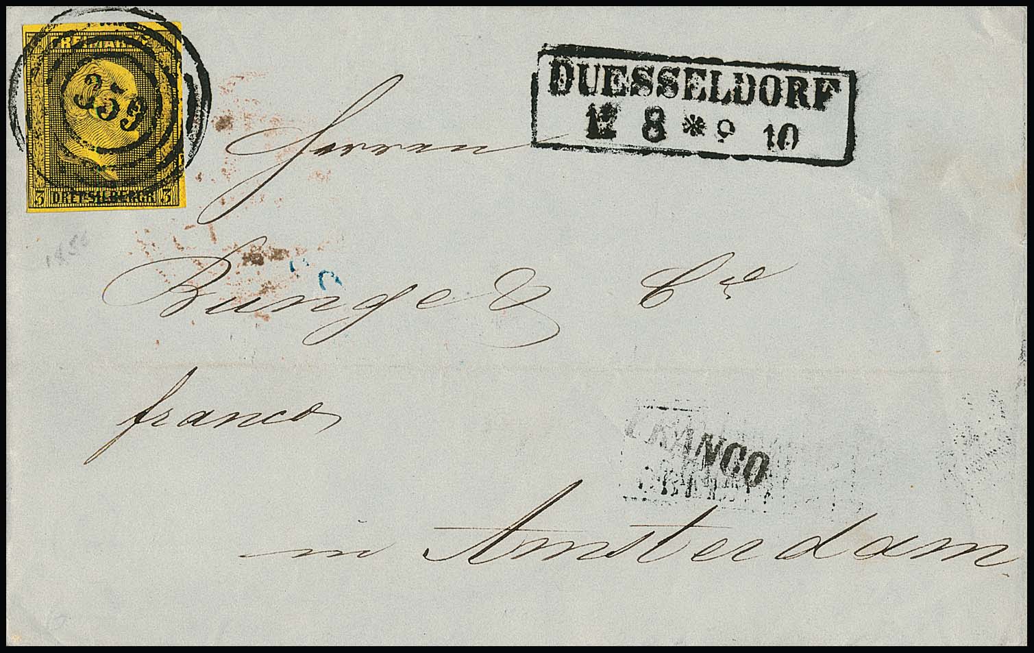 "359" nebst K2 bzw. Ra2 "Düsseldorf" auf drei Kabinettbriefen 1 bis 3 Sgr. (letzterer nach Amsterdam)