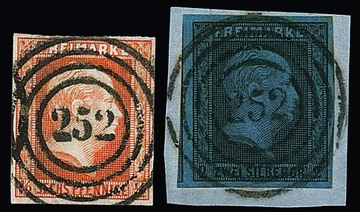 "252" (Coblenz) je sehr schön zentrisch auf Kabinettstück 1/2 Sgr. und auf Luxusbriefstück 2 Sgr.