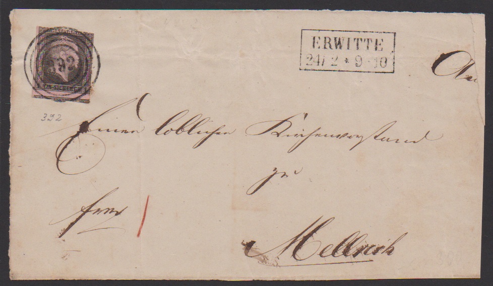 "392" nebst Ra2 "Erwitte" auf Briefvs. mit angeschnittener 1 Sgr. (auf lilarosa)