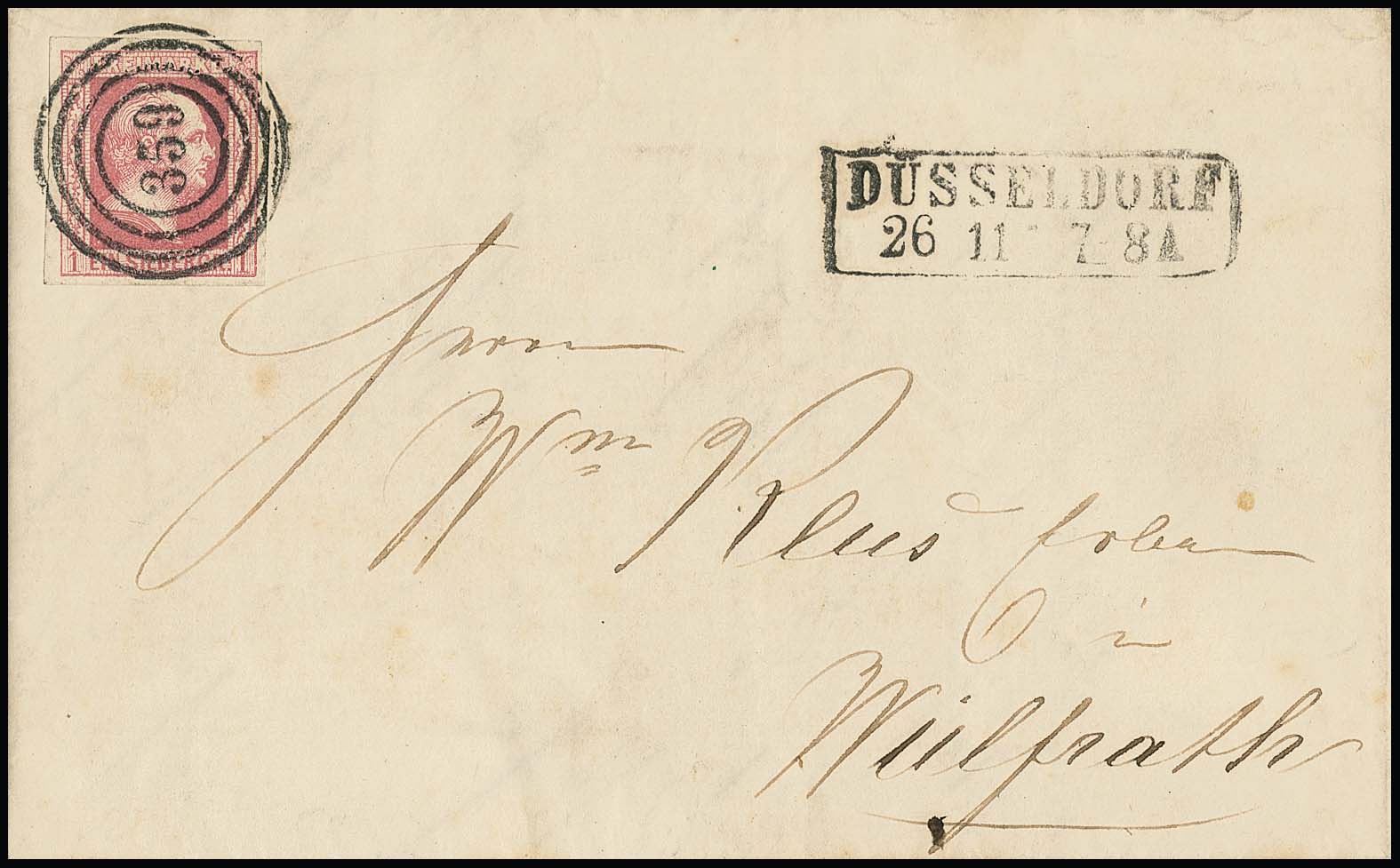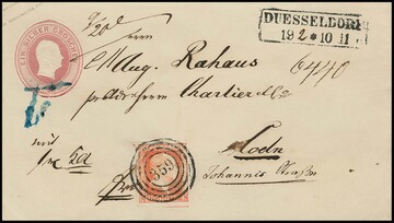 "359" nebst Ra2 "Düsseldorf" (mit hs. Monat!) auf Ganzsache 1 Sgr. rosa, mit Zusatzfrankatur 1/2 Sgr. ziegelrot (rechts ber.) nach Cöln, als seltene Bestellfrankatur