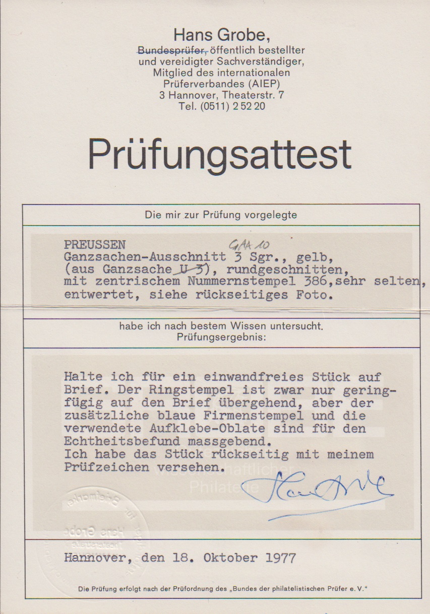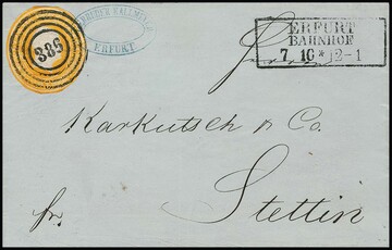 "386" nebst Ra3 "Erfurt Bahnhof" auf Faltbrief 1856 mit üblich rund geschnittenem Kopf-Ganzsachen-Ausschnitt 3 Sgr. gelborange, sign. Grobe mit Attest. Mi. 250,- +