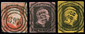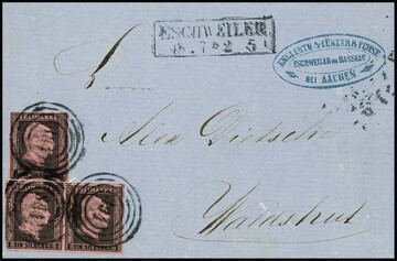 "359" nebst Ra2 "Düsseldorf" auf drei Pracht-/Kabinettbriefen glatter Grund: 1 Sgr. karmin sowie zweimal 3 Sgr. orange. Mi. 380,-