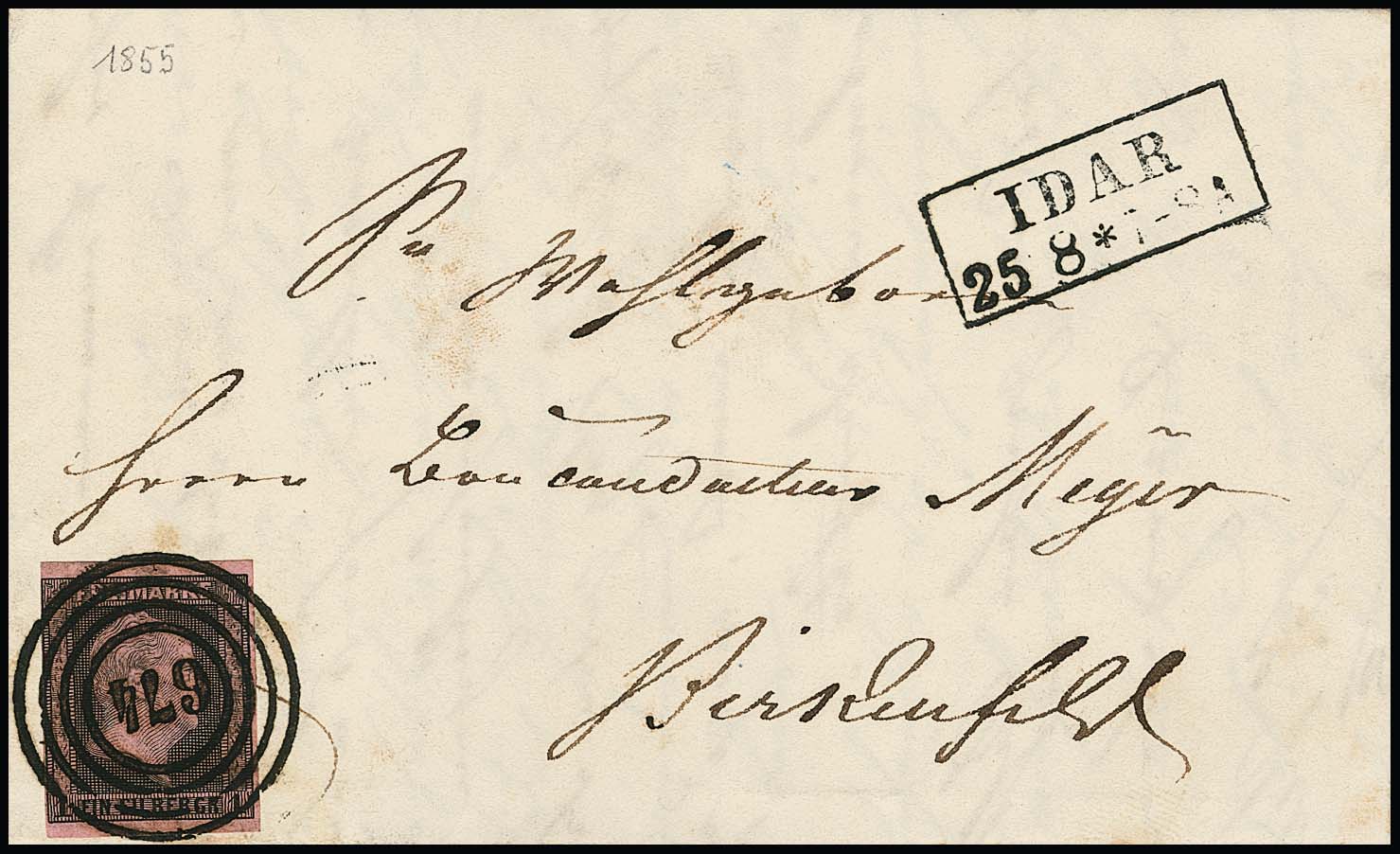 "674" nebst Ra2 "Idar" sehr klar auf Brief 1 Sgr. (links "Lupenrand"). Seltener NS aus dem Fürstentum Birkenfeld, Feuser 400,-