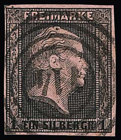 "717" (Kettwig) je klar auf sechs meist Kabinettstücken inkl. 1/2 und 3 Sgr. glatter Grund, dazu Orts-Stempel auf sechs Werten