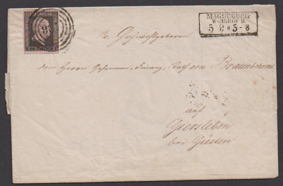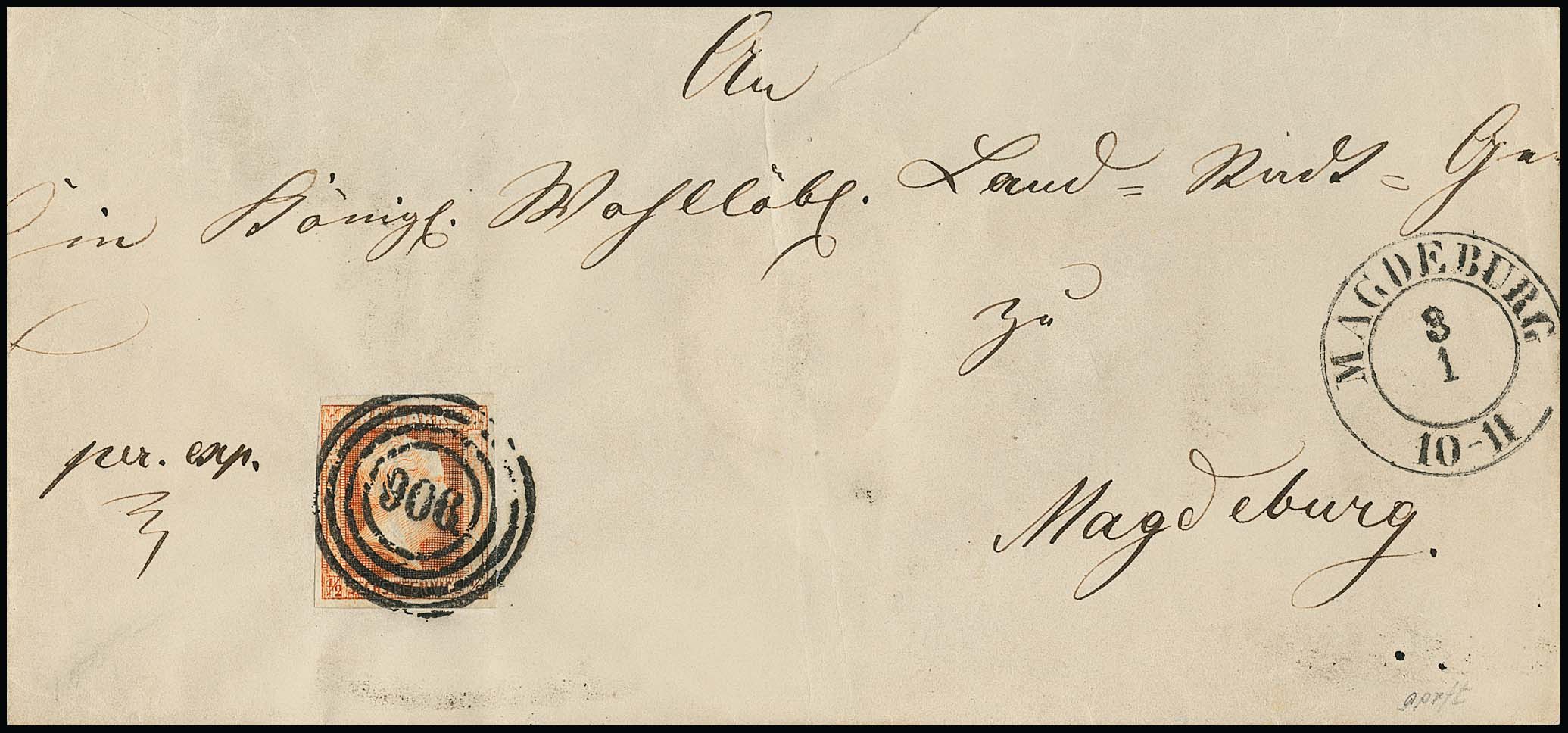 "906" nebst K2 "Magdeburg" klar auf Ortsbrief (kl. Papiermgl.) mit besserer Einzelfrankatur 1/2 Sgr., sign. Meier