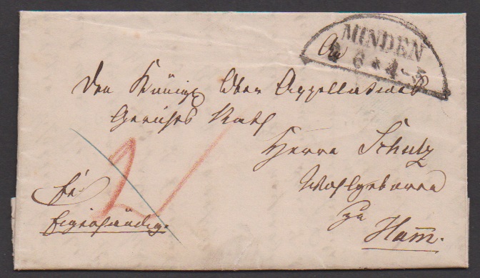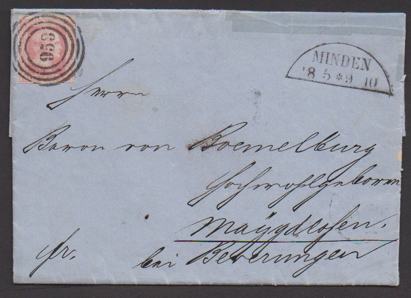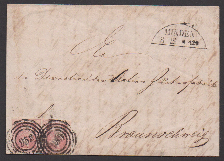 "953" nebst Bahnpost-Segmentstempel "Minden" auf zwei Briefen 1 Sgr. einzeln (gut, Briefpapier am Rand Tesa) bzw. Paar 1 Sgr. (kl. Mgl.), dito der Segmentstempel als Aufgabestempel auf unfrankiertem Brief