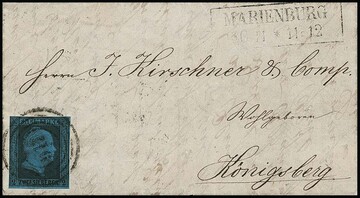 "917" nebst Ra2 "Marienburg" auf Prachtbriefchen 2 Sgr. vom 30.11.1852. Sehr seltener und seit Jahren der erste wieder angebotene Nummernstempelbrief in der ersten Verteilung, das Postamt wurde im März 1854 geschlossen. Attest Meier, Foto siehe Katalog-Rückseite