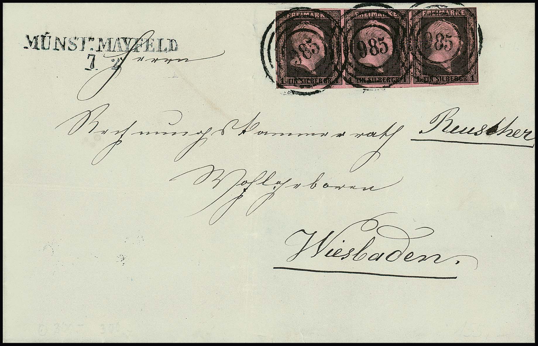 "985" nebst L2 "Münst. Mayfeld" auf Faltbrief mit tieffarbigem Dreierstreifen 1 Sgr. (oben etwas ber.)