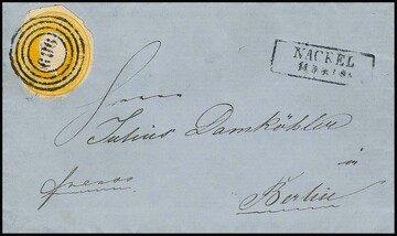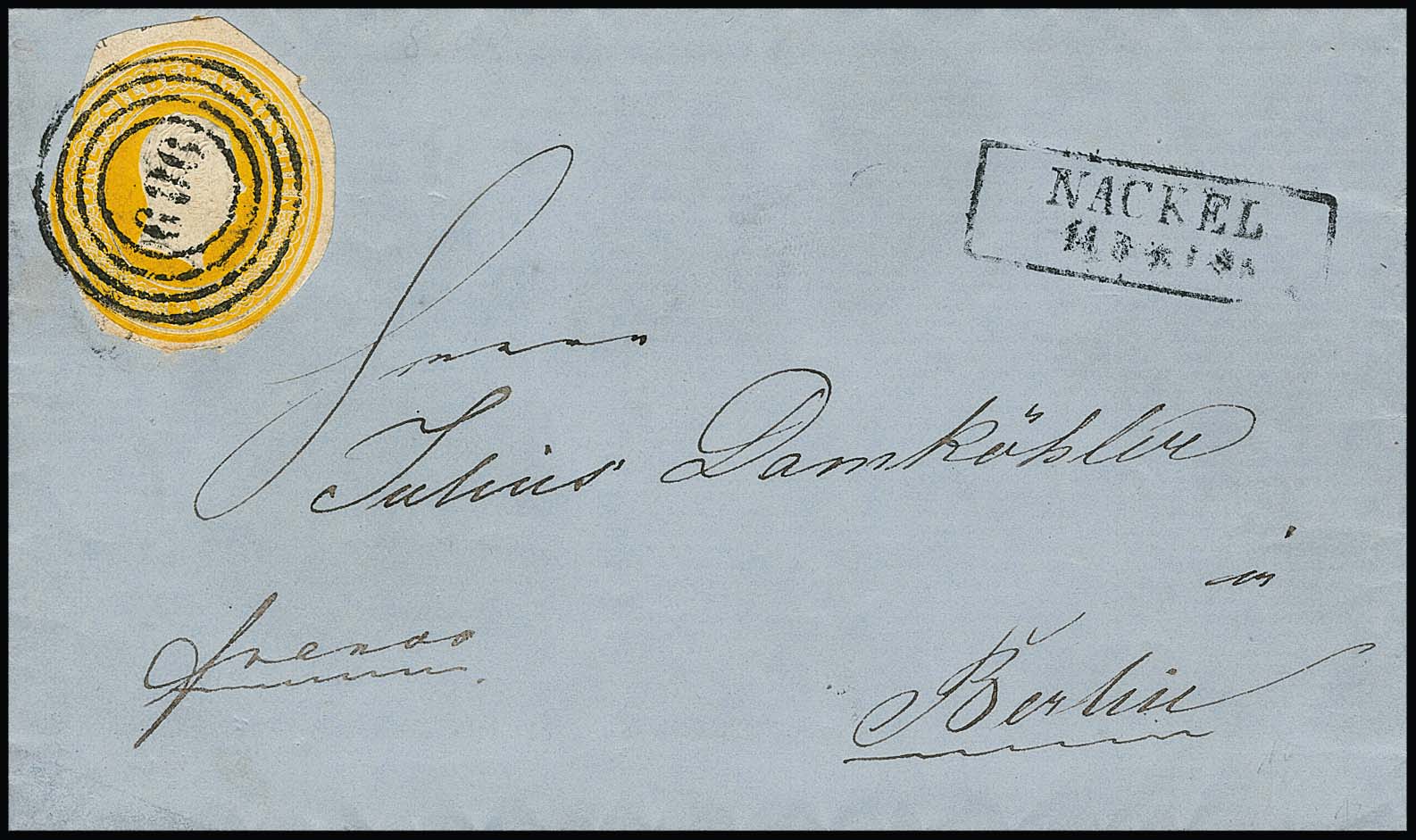 "989" nebst Ra2 "Nackel" klar auf Faltbrief mit üblich rund/achteckig geschnittenem Kopf-Ganzsachen-Ausschnitt 3 Sgr. gelborange. Der Brief datiert vom 11.3.1860 (!) und ist einer der spätesten registrierten Nummernstempelbriefe dieses Ortes überhaupt, entsprechend im Preußen-Rundbrief Nr. 61 beschrieben. Mi. 250,- ++, sign. Banker