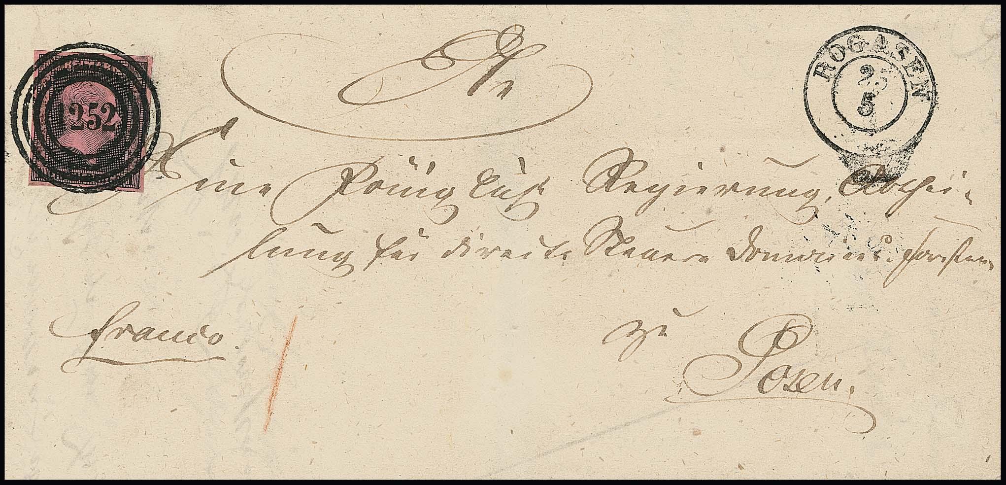"1252" nebst K2 "Rogasen" besonders klar auf Brief 1 Sgr. (unauffällige Mgl.)