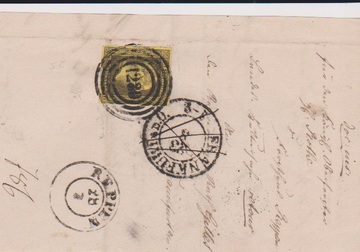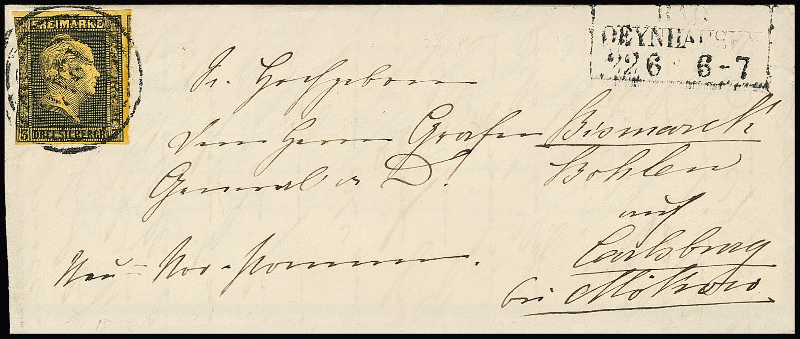 "1214" nebst Ra3 "Bad Oeynhausen" klar auf Faltbriefchen (an den Grafen Bismarck-Bohlen) mit 3 Sgr. schw./maisgelb (links angeschnitten) mit kpl. Inhalt 1858, nach Umbenennung