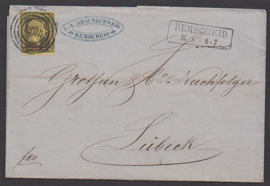 "1228" nebst Ra2 "Remscheid" auf Brief 3 Sgr., links unten berührt, aber ungewöhnliche Destination Lübeck!