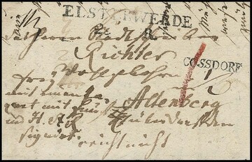 "Elsterwerde", (1820), L2 in seltener Schreibweise (statt "Elsterwerda"), nebst gleichfalls seltenem L1 "Cossdorf" auf Brief, sowie der Nierenstempel vs. als Transitstempel auf Brief