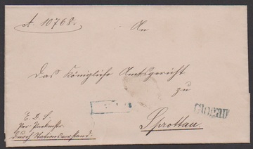 "Glogau", (1880), seltener blauer L1 des Reichsbahn-eigenen Bahnkurierdienstes auf Brief (mit zusätzlichem Datums-Ra1) nach Sprotten