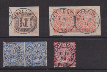 "Essen bei Wittlage" (Ra3), sowie Gross-Logisch, Nieder-Linda, Nikolaiken etc., drei Briefe, zwei Briefstücke und drei lose Marken je mit späten Grotesk-Stempeln auf NDP