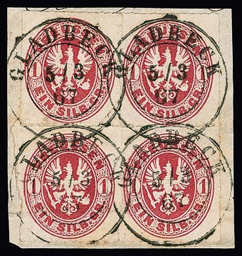 "Gladbeck", seltener neuer K2 klar auf Briefstück mit dekor. Viererblock 1 Sgr. (linke untere Marke kleine Durchstich-Unebenheit). Sign. Berger, Banker