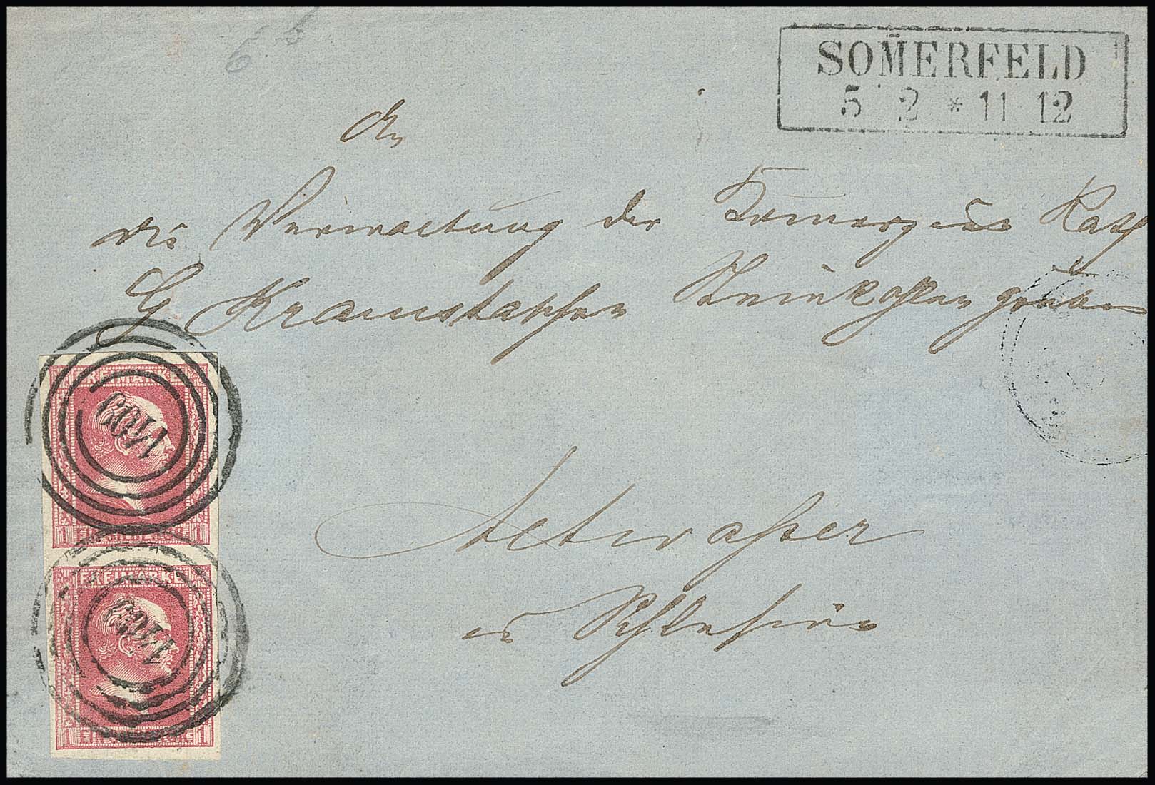 "1409" nebst Ra2 "Sommerfeld" auf Briefvs. mit Kabinettpaar 1 Sgr. karmin