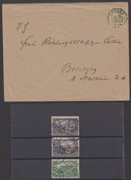 "Goyatz", sehr spät nachverwendeter Preußen-K2 der früheren Hilfspostanstalt klar auf drei losen Werten Germania-Mark-Werte Querformat, 1920, von gleicher Paketkarte, sowie 1921 auf Brief Germania 60 Pfg.
