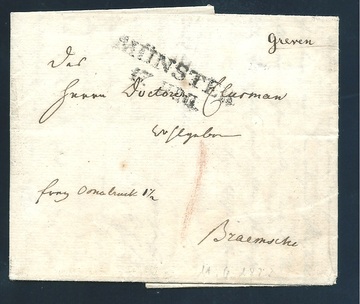 "Greven", 1822, hs. Postwärteraufgabe, nebst L2 "Münster", auf Brief mit Inhalt nach Bramsche